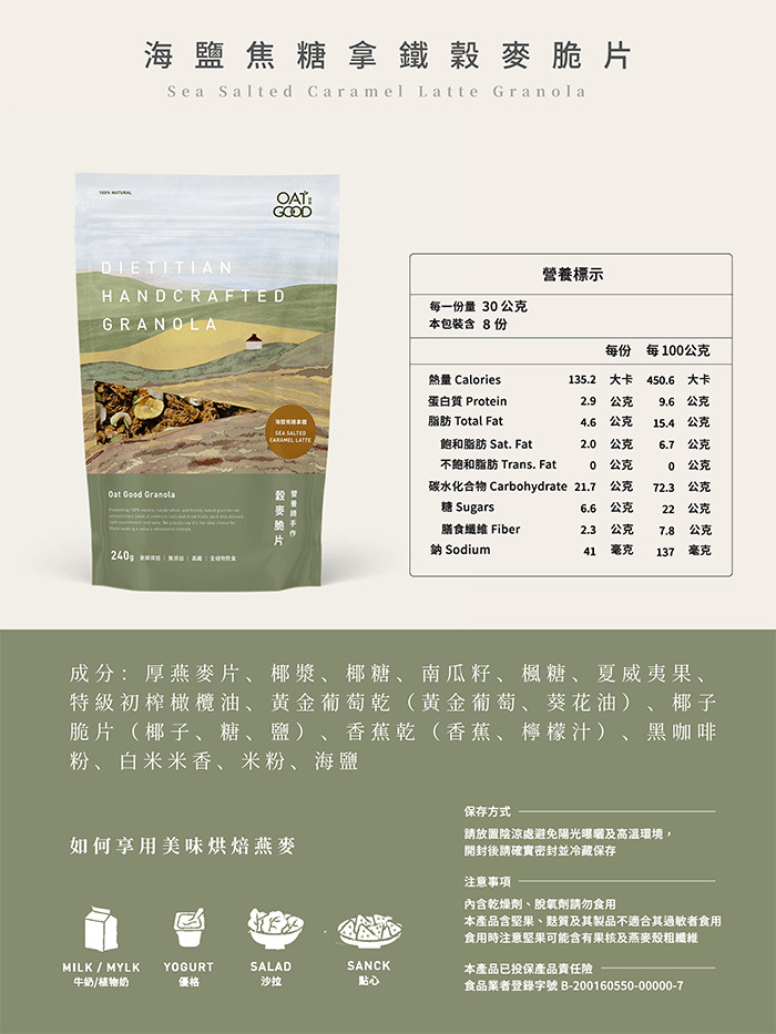 選用堅果香氣十足的阿拉比卡咖啡豆研磨成黑咖啡混拌椰奶烘烤而成,搭配自製香蕉乾、椰子脆片、黃金葡萄乾,是咖啡愛好者不能錯過的新潮款穀麥脆片。