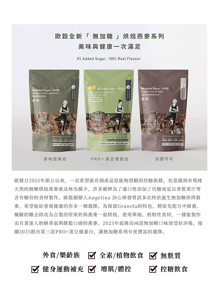 歐穀全新 “無糖” 系列誕生! 營養師研發0%系列保留了Granola口感特色加入自製堅果奶與燕麥一起烘焙,延續使用植物性食材製作出香氣迷人有堅果奶酥蓬鬆口感,健康極致又純粹的天然烤燕麥。