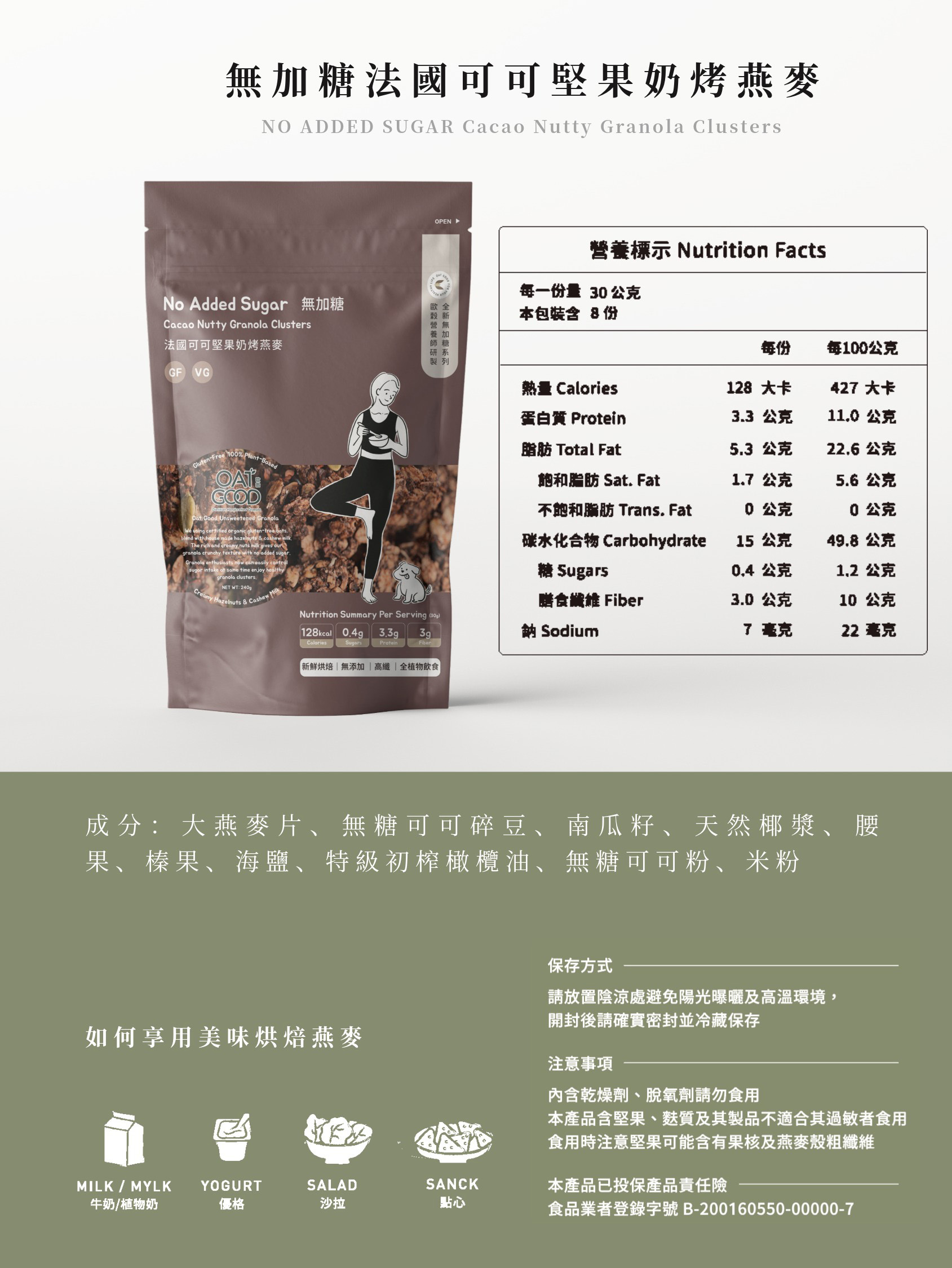 [成份] 大燕麥片、無糖可可碎豆、南瓜籽、天然椰漿、腰果、榛果、海鹽、特級初榨橄欖油、無糖可可粉、米粉
